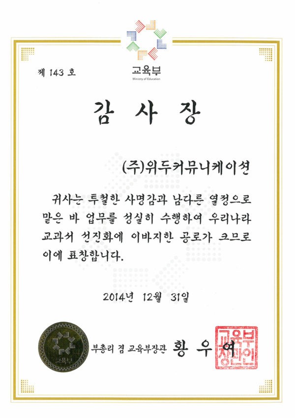 감사장 제 143호 페이지 정보 작성자 WeDu 댓글 0건 조회 5,789회 작성일 19-05-30 19:33 본문 2014-12-31 감사장 제 143호 교과서 선진화 부총리 겸 교육부장관 황우여 List Previous산업통상자원부 표창장 19.05.30 Next한국여성벤처협회 표창장 19.05.30