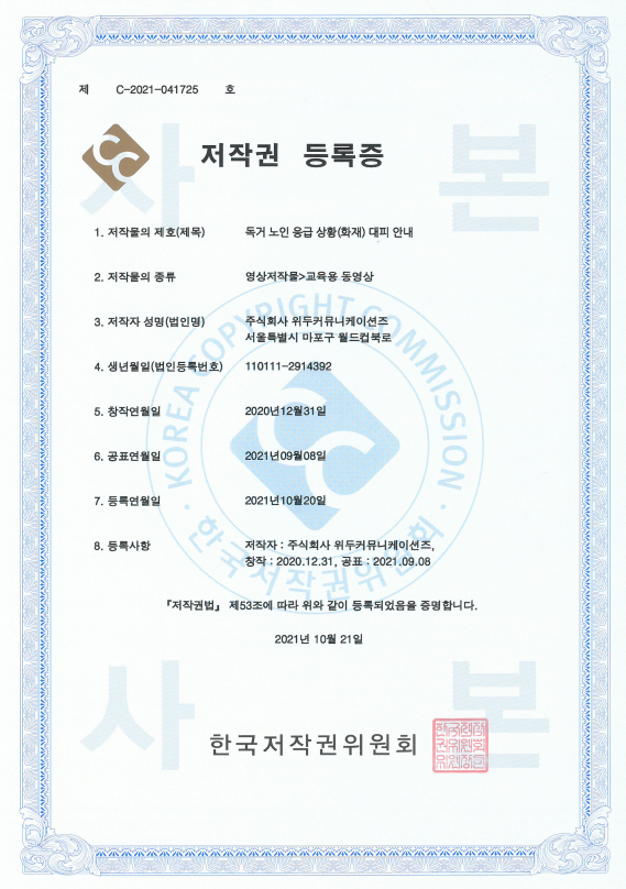 [한국/저작권] 독거 노인 응급 상황(화재) 대피 안내 페이지 정보 작성자 WeDu 댓글 0건 조회 6,191회 작성일 21-12-31 12:41 본문 2021-10-21 저작권 C-2021-041725 영상저작물>교육용 동영상 List Previous[한국/저작권] 장보기 인지훈련 게임 21.12.31 Next[한국/저작권] OLL KIDS/MATH 21.12.31