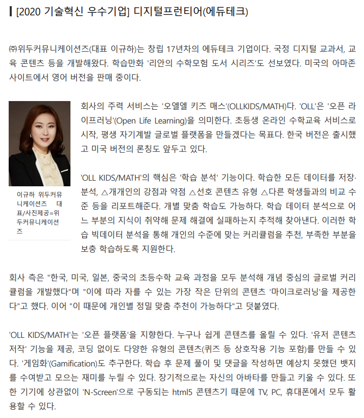 위두커뮤니케이션즈, 빅데이터 기반 맞춤교육 'OLL KIDS MATH'